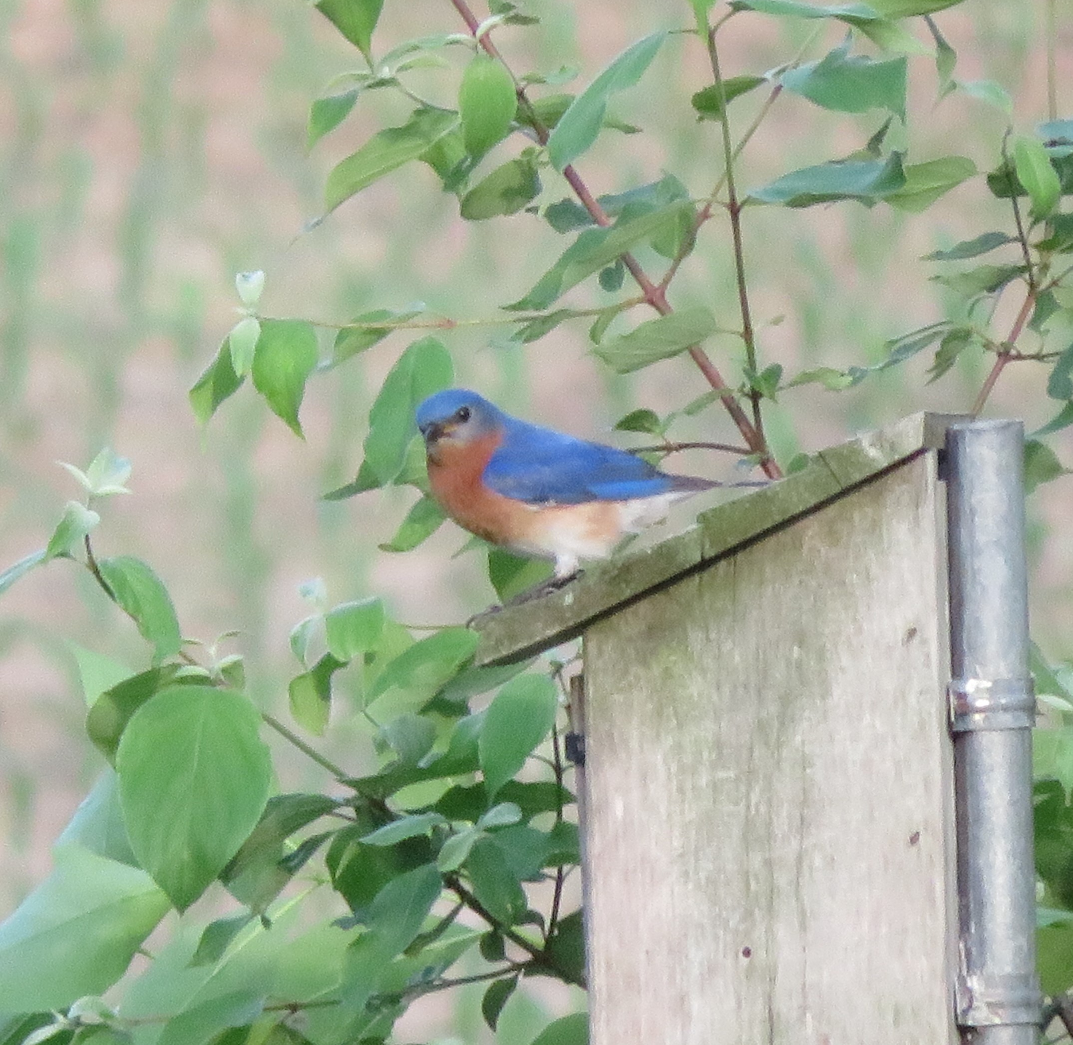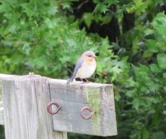 When my husband got home from work, we went and bought what we needed to put up a bluebird house, and they moved into it. We had bluebirds for many years, but about 7 years ago, the sparrows took over the houses and life was too hectic to keep up with the battle, so no more bluebirds in the houses… until this week! I have a pair of bluebirds actively nesting in the one remaining box!