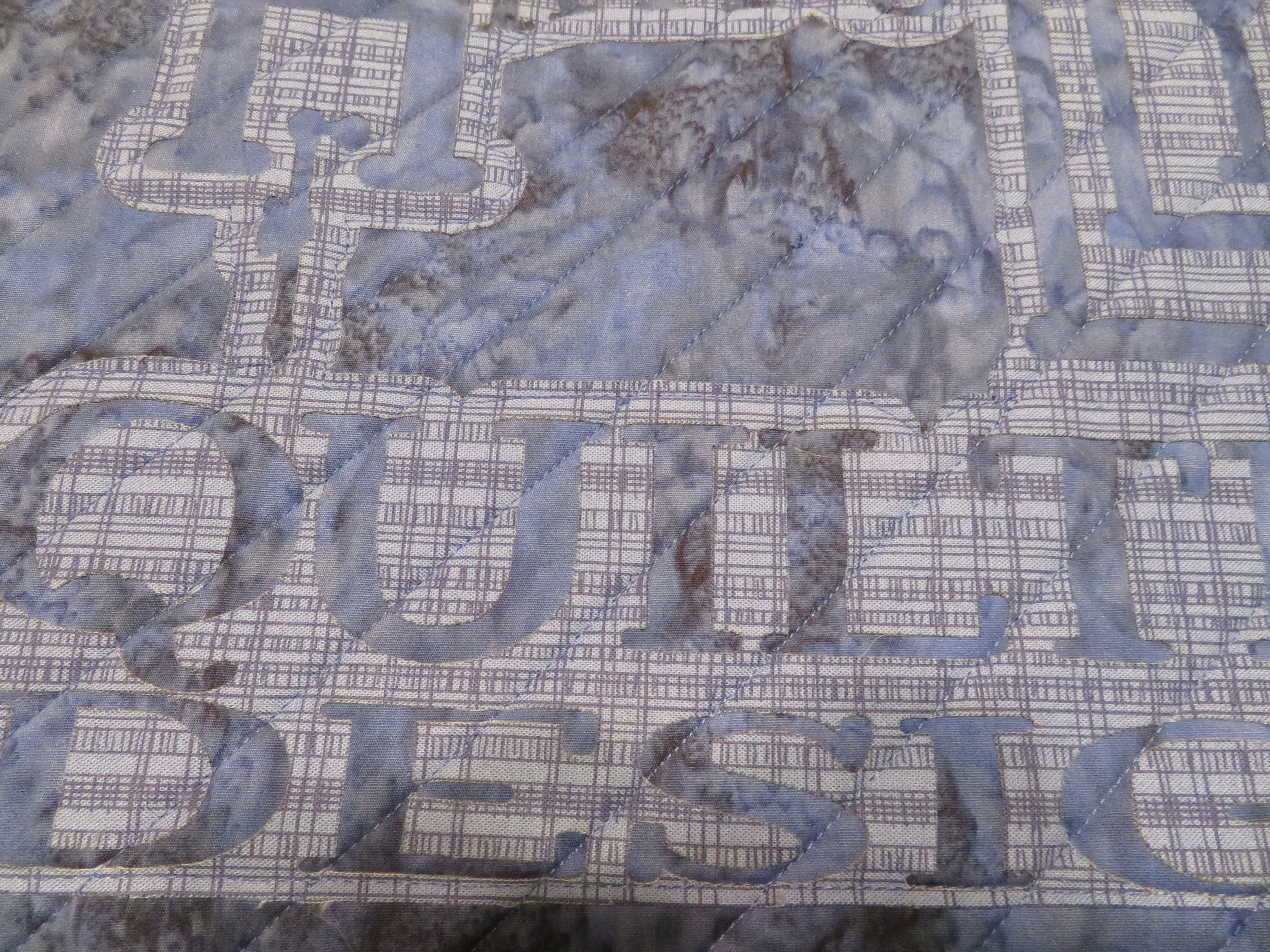 After ironing the applique to my fabric for the tote bag, I raw edge appliqued the design down. To do this, I used a straight stitch and stitched about 1/8” from the edge of the applique all the way around the outside of the applique. However, I did not sew down every inside edge. Then, I used the walking foot on my home sewing machine, regular quilting thread, and a 14/100 topstitching needle, and quilted diagonally across the entire piece of fabric that I was making the bag from. I started at the center of the design and used the lines on my ruler to make sure I was getting a 45° angle and marked the first line of stitching with 3/4″ wide blue painters tape. I stitched close to both sides of the tape, and then repositioned the tape, with an edge against the stitched line, and stitched the other edge. I continued until that entire side of the piece was quilted, went back to the center and did the same to complete the other half. This diagonal quilting helps hold the applique in place as well. All of this stitching is going over the applique with the Steam a Seam 2 without issue.
