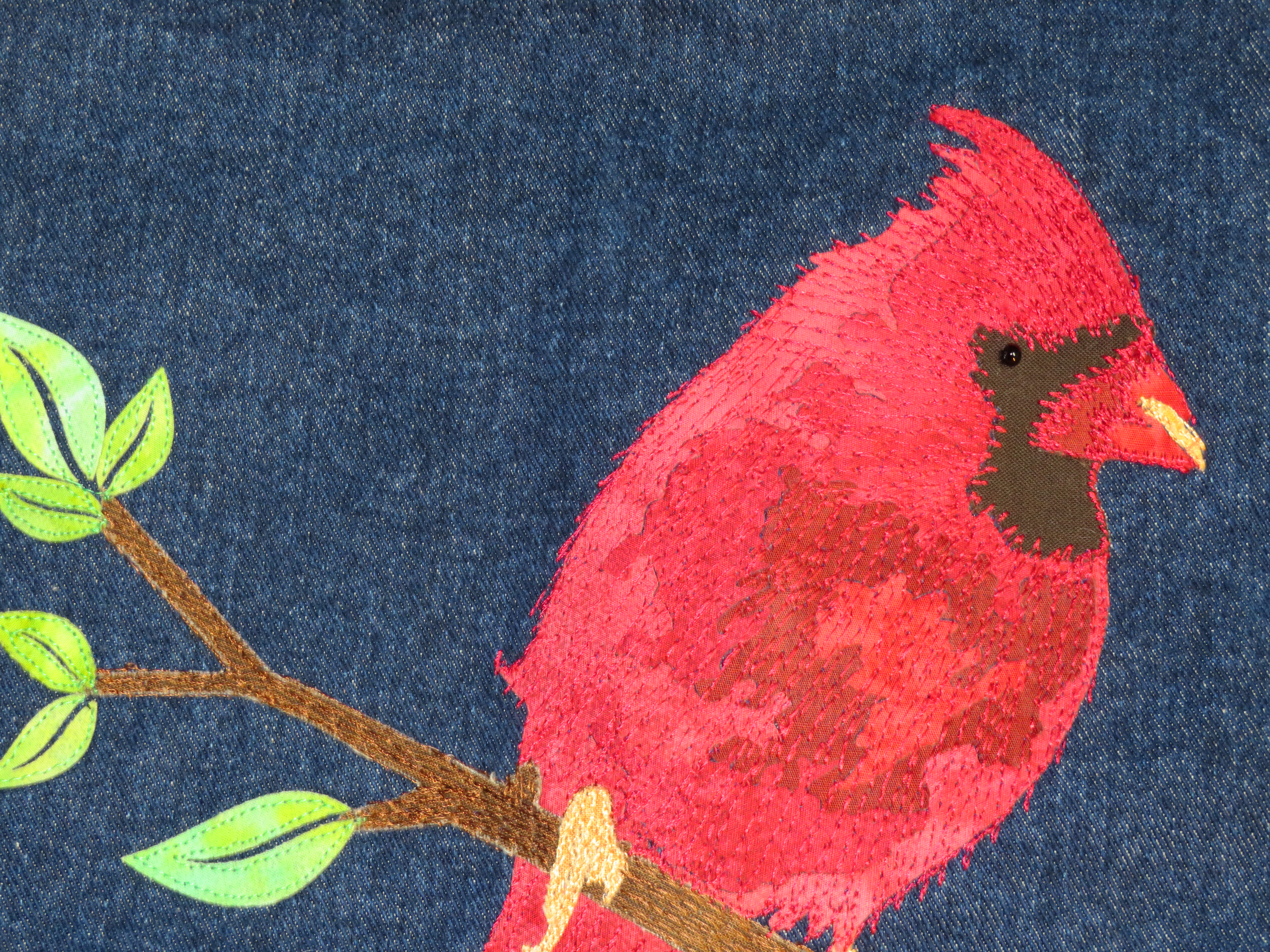 I did choose to use free motion embroidery on the cardinal on the back of my denim jacket to not only add interest to the applique, but also to protect it from the wear and tear the back of a jacket encounters on chair and seat backs. Even then, I used raw edge applique on the leaves, and they have held up fine! The process of using a laser to cut the pieces melts the fusible into the cut edge of the fibers and really helps to stabilize the edges and keep them from fraying.