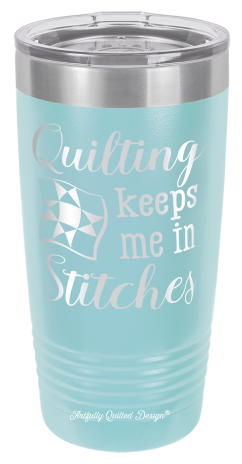 “Quilting keeps me in Stitches”. This 20-ounce tumbler is perfect for sewists, quilters, and fabric lovers who appreciate a bit of humor with their morning coffee or afternoon tea.
