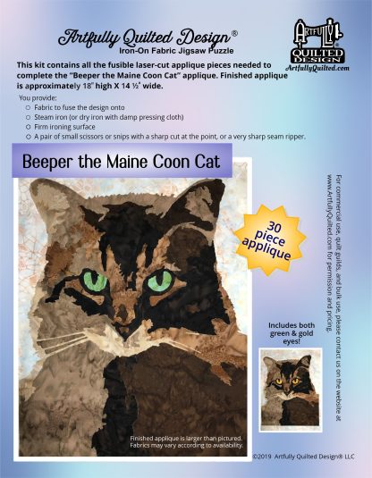The “Beeper the Maine Coon Cat” applique iron-on puzzle kit is the perfect addition to the decor of a cat loving home! You can embellish a quilt, create a beautiful piece of art for over your sofa or bed, create a large throw pillow, or what ever your creativity dictates! Some have even put it on the back of a jacket. This large iron-on) laser-cut applique measures a large 18″ high X 14 ½” wide when completed.