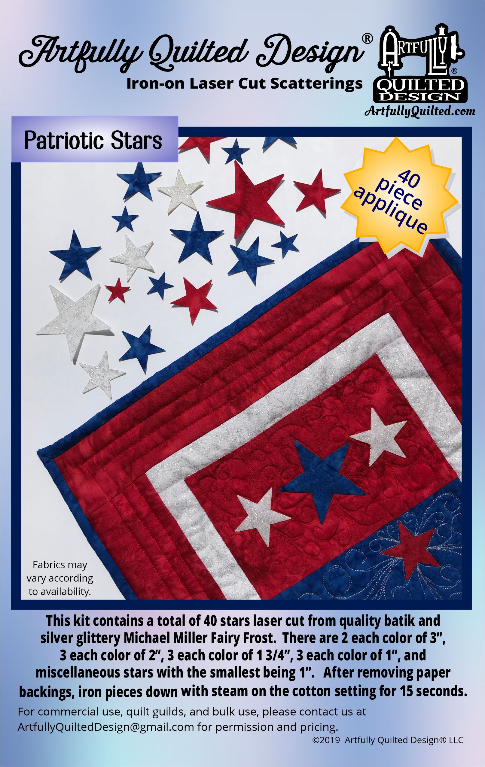 The Patriotic Stars Iron-On kit contains 40 fusible (iron-on) laser cut pieces to allow you to create quickly and beautifully! The red and blue fabrics in this kit are high quality batiks and the white fabric is Michael Miller Fairy Frost. The white stars twinkle with silver glitter!