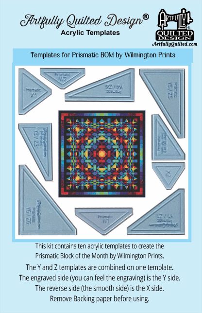 These Prismatic Acrylic Templates are produced in collaboration with Wilmington Prints for the “Prismatic Block of the Month Quilt”. Our templates have been reviewed against the pattern and approved by WP. This set of ten templates are cut of 3mm (1/8″) transparent blue acrylic. These are transparent enough to see through, while being colorful enough to find on your table. The instructions in the pattern (NOT included) show 16 templates, however the Z templates are the reverse sides of the Y templates. This is explained on the package and each template is labeled as such.