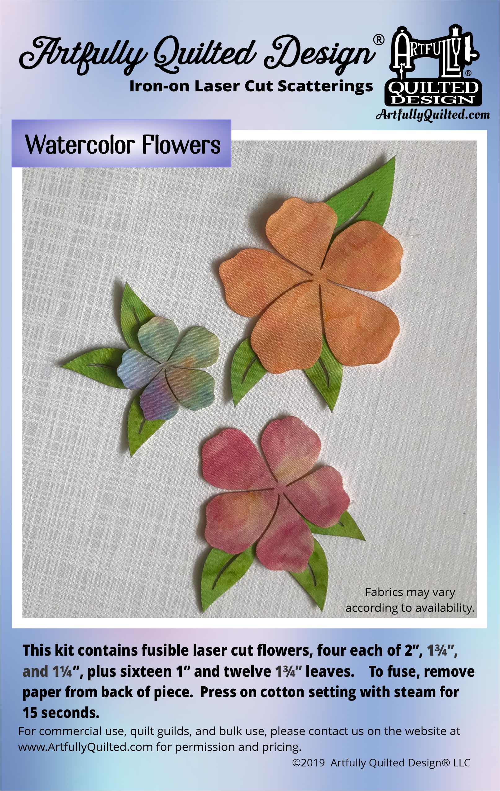 This kit contains Iron-On Watercolor Flowers Laser-Cut Fabric Appliques, four each of 2”, 1¾”, and 1¼”, plus sixteen 1” and twelve 1¾” leaves. Iron pieces down with steam on the cotton setting for 15 seconds.